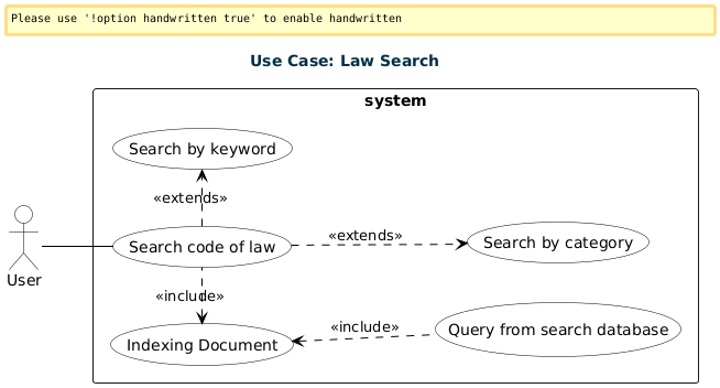 | 1. Search code of law | The primary action where a User searches for legal codes or documents. |